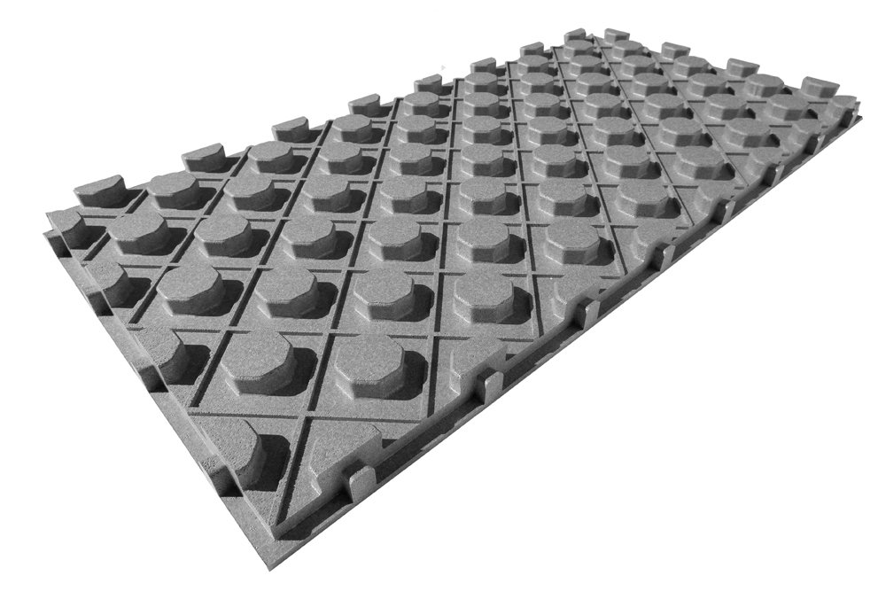 Effektive og brukervennlige gulvvarmeplater på 1200x600x47 mm (0,72 m²) i formstøpt polystyren, designet for optimal varmefordeling og enkel installasjon i vannbårne gulvvarmesystemer.
